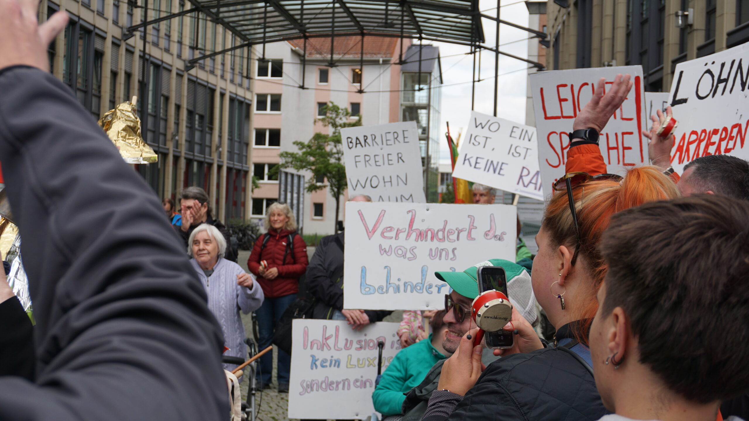 Am 5. Mai ist der Internationale Protesttag für die Gleichstellung von Menschen mit Behinderungen. Wir haben uns 15 Uhr vor dem Sächsischen Städte- und Gemeindetag versammelt. Das war nicht zu überhören. Laut und bunt haben wir uns für die Rechte von Menschen mit Behinderungen eingesetzt. Anett Heinich hat die Forderungen des ZSL an einen Vertreter des Städte- und Gemeindetages übergeben. In den Forderungen geht es um mehr Barrierefreiheit und Inklusion in den sächsischen Städten und Gemeinden. Das Sächsische Inklusionsgesetz muss dahingehend geändert werden, dass es auch die Städte und Gemeinden in die Pflicht nimmt. Inklusion ist kein Luxus, sondern für viele Menschen ein Grundrecht. Sie darf also nicht am Geld scheitern, sondern muss immer mitgedacht und gelebt werden.