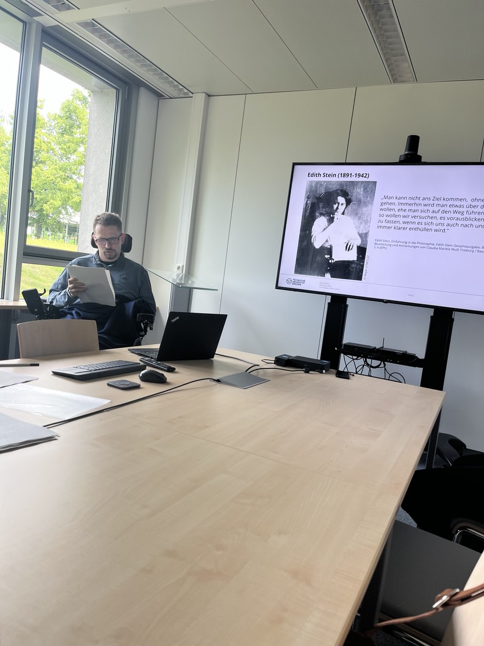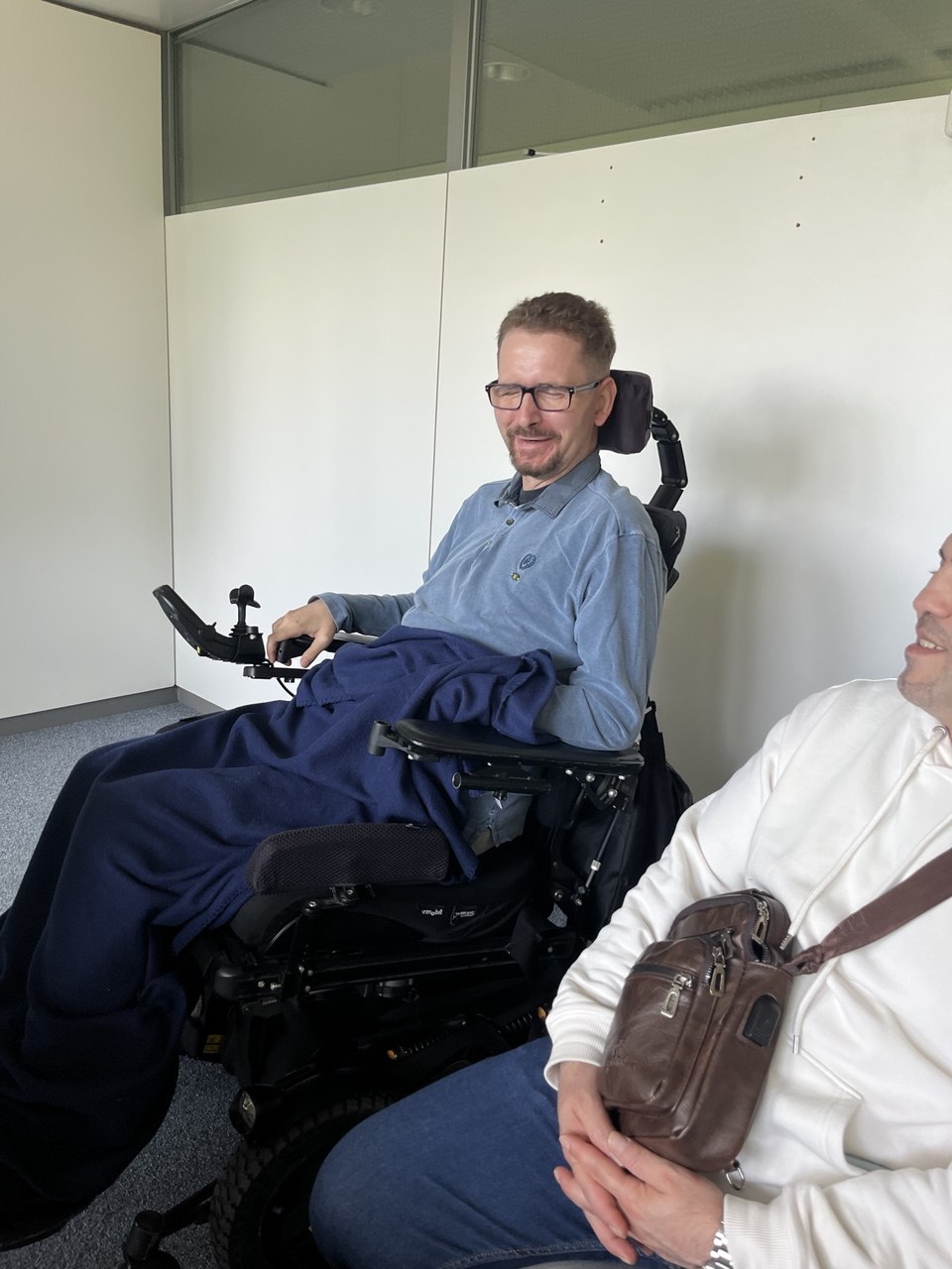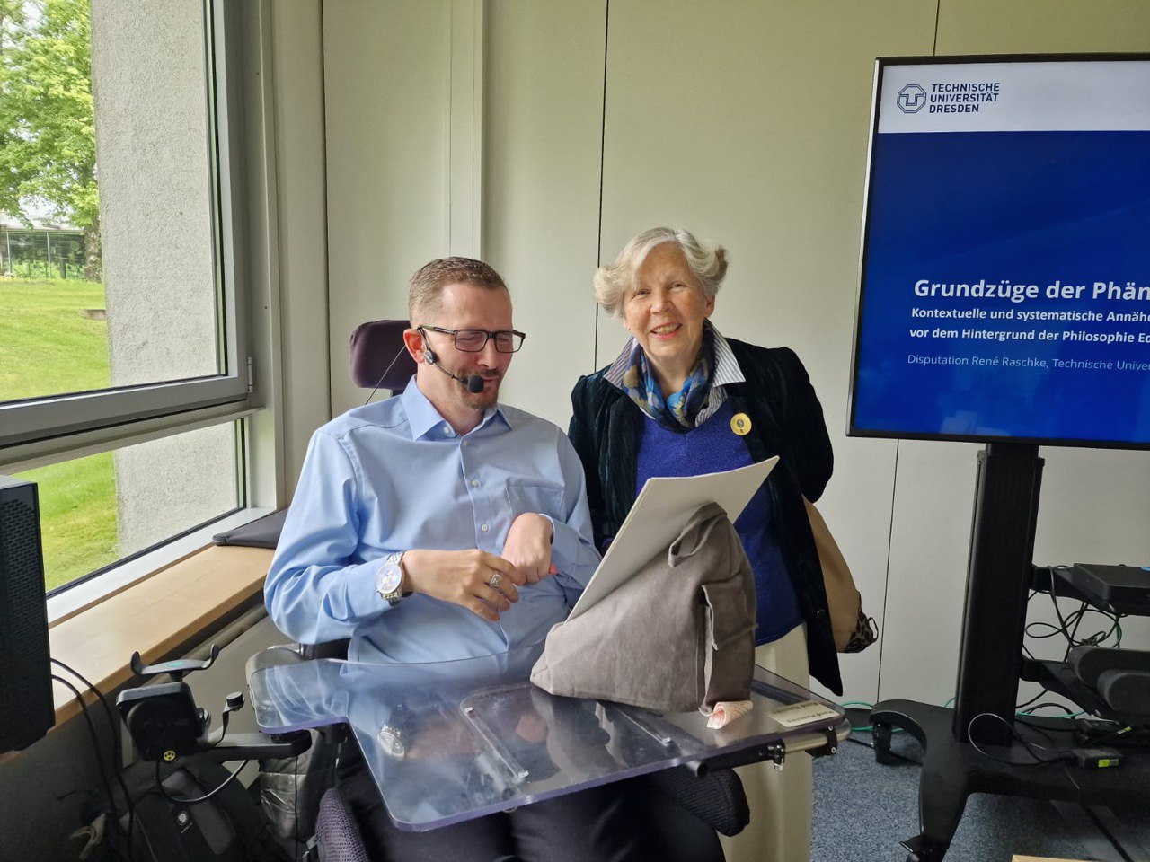 René Raschke ist seit dem Sommer 2022 bei Verso ehrenamtlicher Prüfer für Leichte Sprache. Wir haben uns von Anfang an gegenseitig unterstützt, er uns bei unseren Texten, wir ihn bei seiner Doktorarbeit. Diese Arbeit bedeutete ihm sehr viel, leider konnte er sie durch seine Erkrankung nicht fertigstellen. Wir waren überzeugt, dass er es schaffen kann und haben Kontakt zu seiner Professorin aufgenommen. Professorin Gerl-Falkovitz hat sich um eine Prüfungskommission gekümmert und sich dafür eingesetzt, dass seine Arbeit angenommen wird. Also haben wir seine Texte zusammengestellt und als gebundene Arbeit bei der TU Dresden zur Begutachtung eingereicht. Die Arbeit hat von beiden Begutachtenden die Auszeichnung „Magna Cum Laude“ bekommen. Am 8. Mai um 13 Uhr hat René seine Arbeit mündlich verteidigt, wieder mit der Auszeichnung „Magna Cum Laude“. Er ist nun Herr Dr. René Raschke und wir könnten nicht glücklicher und stolzer sein! Damit hat er als erster gezeigt, dass der Erwerb einer Behinderung nicht von einer Promotion abhalten muss.
