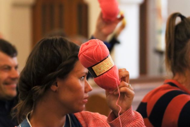 Dompfarrer Büchner verknotet die Wollfäden, die Gemeinschaft ist fest verbunden.
